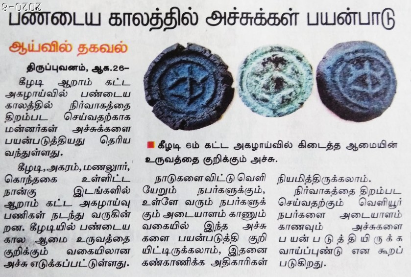 Another evidence for administration is the ancient seals. These seals are from the Sangam era found at the sixth phase of the Keelazhi excavation. According to Dinamalar National Daily, these are seals of the ancient tortoise image. These may have been used to identify people leaving and entering countries, and may be assigned by the authorities to monitor this. It is said that the seals have been used to effectively manage and identify outsiders.