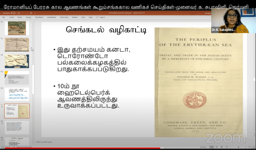 On the other hand, the sea trade of Tamils with the Roman Empire in the Sangam Era indicate that documents must have been created for their sea trade administration. That means, there must have been a record-keeping and archiving system. The only preserved and available archival documents about the Tamil trade with the Roman Empire are foreign archival materials. For instance, the English translation of the Greco-Roman periplus, “The Periplus of the Erythrean sea” (1912)1, by Wilfred H. Schoff. The original manual is a manuscript document that lists the ports and coastal landmarks. It includes approximate intervening distances, that the captain of a vessel could expect to find along with a shore. It contains the business practice in the sea trade, the laws to be followed at the ports (customs), details about the traders that came from Roman, Arabia, and various places in, nowadays, India to the ancient Tamil country2 in South India. As well as the business events and details about major trade items.