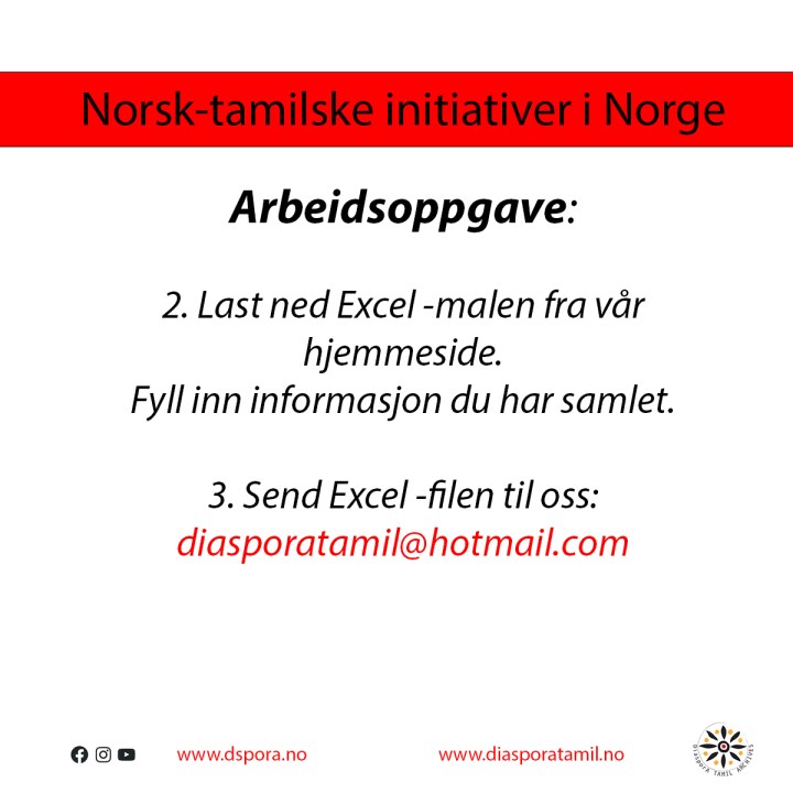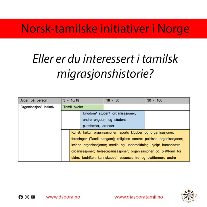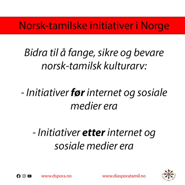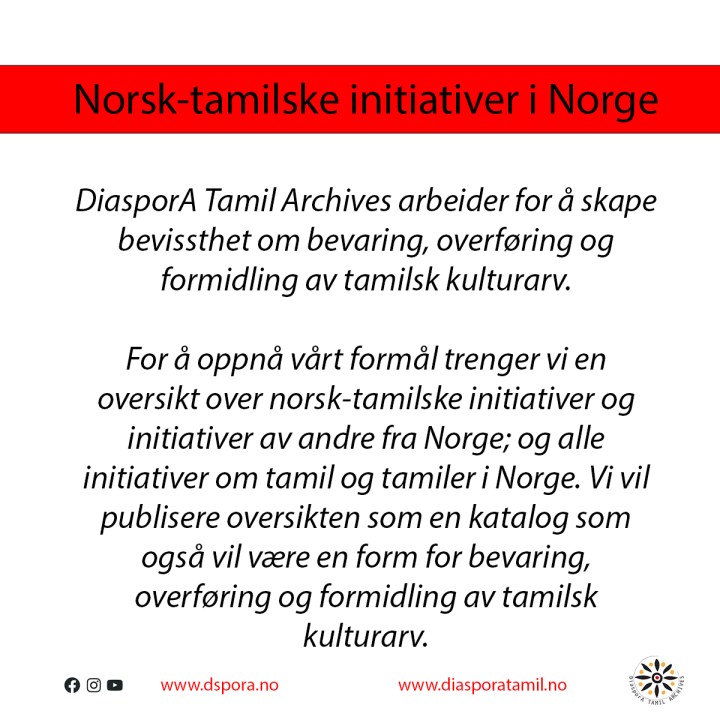 DiasporA Tamil Archives works to create awareness of preservation, transmission and dissemination of Tamil cultural heritage. To achieve our purpose, we need an overview of Norwegian-Tamil initiatives and initiatives on Tamil and Tamils by others from Norway; and all initiatives on Tamil and Tamils in Norway. We will publish the overview as a catalog which will also be a form of preservation, transmission and dissemination of Tamil cultural heritage.